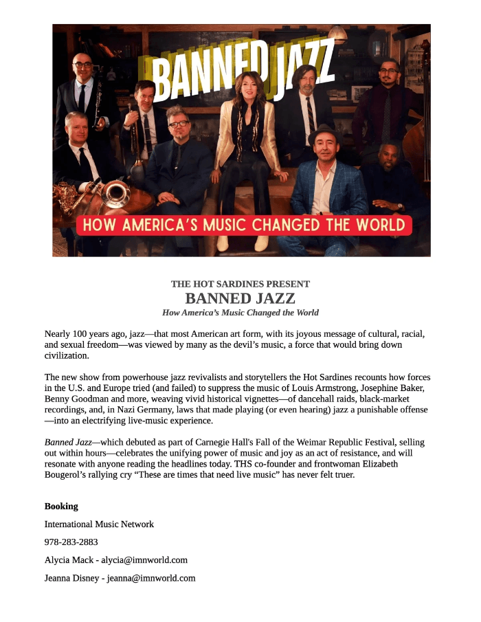 Her passion for sharing the untold stories of songs and artists has positioned her as a key figure in the movement of women redefining the classic jazz singer. Her ability to blend vintage sounds with a modern sensibility has set her apart as one of the genre's most innovative voices. Her natural gift for audience connection is what WBGO’s Nate Chinen calls “the secret sauce.” Additionally, her creation of projects like Banned Jazz with the Sardines, which debuted at Carnegie Hall in 2024, and Appetites, her new solo project, which launched in 2024 with sold-out performances at Joe’s Pub and Birdland, further showcases her versatility and commitment to pushing the boundaries of early jazz and blues.